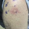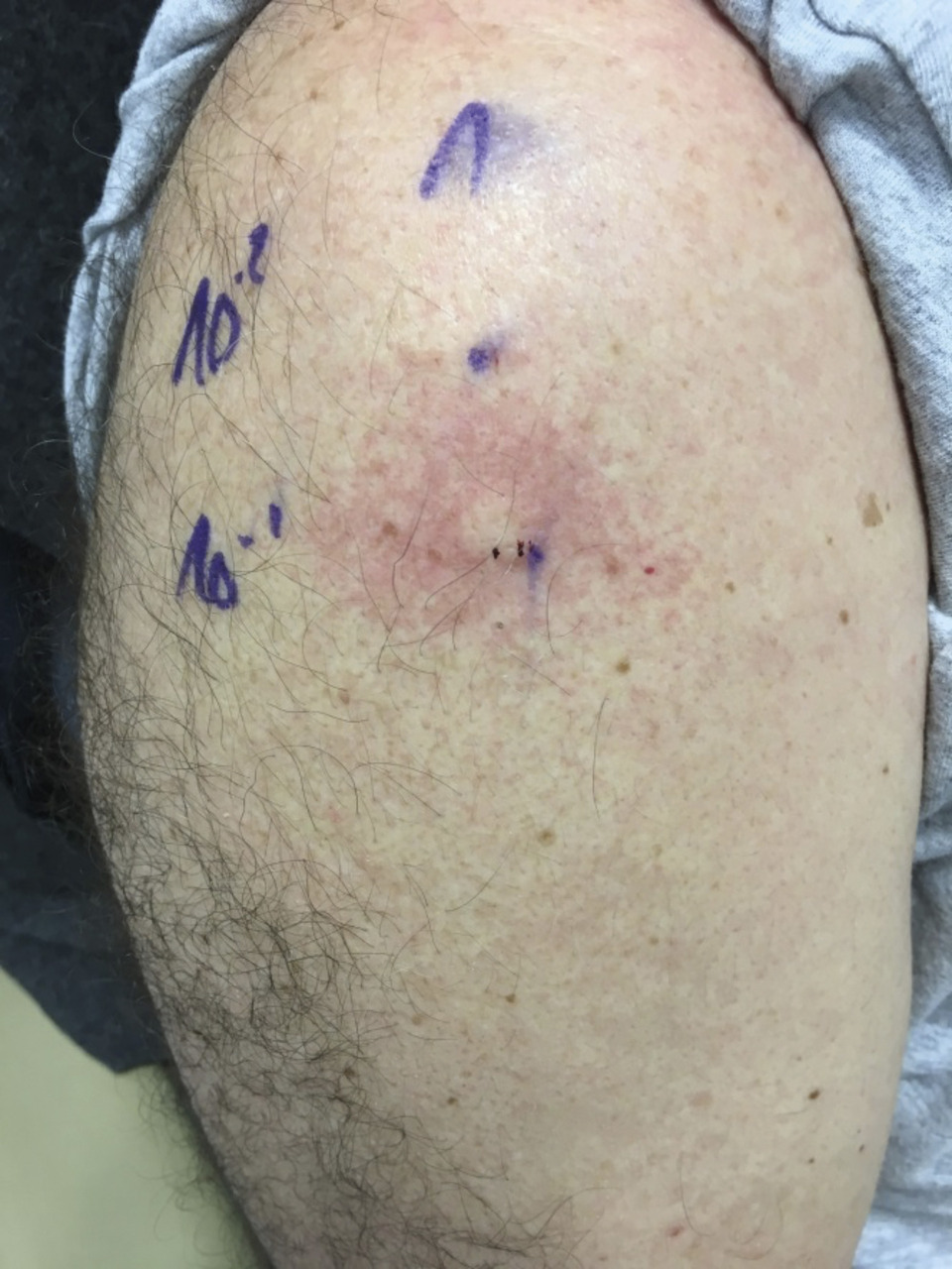 - le grade 1 correspond aux réactions bénignes, avec des signes cutanéomuqueux purs, sans atteinte viscérale : érythème généralisé, urticaire avec ou sans angio-œdème du visage, mais sans signe d’atteinte laryngée ;