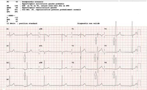 Un militaire de 30 ans, bénéficie d’un électrocardiogramme (ECG), lors d’une visite médicale périodique ; celui-ci montre un rythme du sinus coronaire. Le jeune homme pratique six heures de sport d’endurance par semaine (course à pied, vélo et aviron). Il n’a pas de symptôme à l’effort ni d’antécédent personnel ou familial. L’examen clinique est normal. L’analyse du tracé montre un rythme sinusal et régulier avec une fréquence cardiaque à 45 battements par minute (figure). L’axe est à gauche. Les ondes P sont d’amplitude normale mais négatives en D2, D3, aVF, V3, V4, V5 et V6. L’intervalle PR est mesuré à 196 ms. Les QRS sont fins.