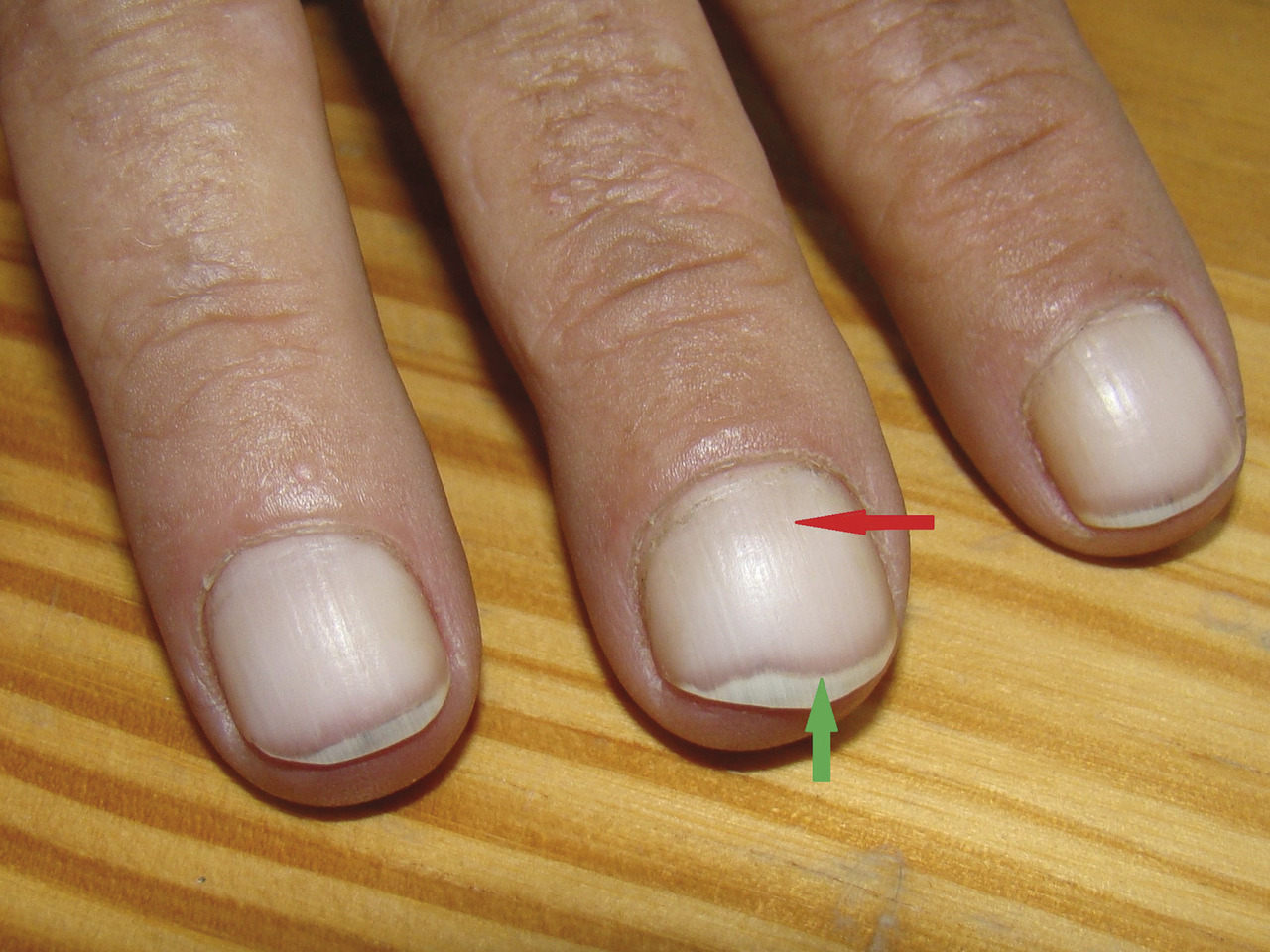 Il s’agit d’une leuconychie le plus souvent totale et bilatérale entraînant une absence de visibilité de la lunule (flèche rouge). Elle est délimitée par une bande rose foncé, située juste en partie proximale du bord libre de la tablette unguéale (flèche verte).