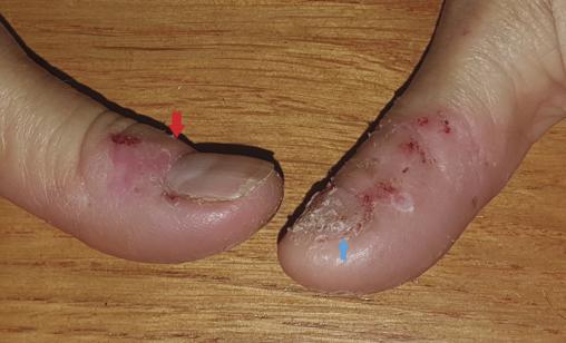 Joseph, 45 ans, consulte pour des anomalies unguéales – ongle effrité – et péri-unguéales – desquamations – (figure ), majorées depuis cinq mois. Le patient évoque également des sensations de brûlures au niveau péri-unguéal.