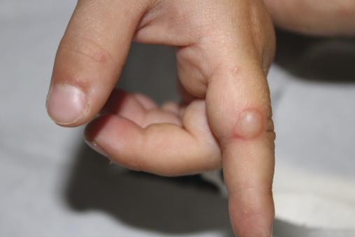 Nous voyons le jeune Nicolas, 5 ans, avec ses grands-parents. Ces derniers sont inquiets car leur petit-fils a, depuis 24 heures, une bulle au niveau d’une phalange de l’index de la main gauche (photo ). Cette lésion est apparue après un séjour en montagne, dans une ferme spécialisée dans la production de fromages de brebis.
