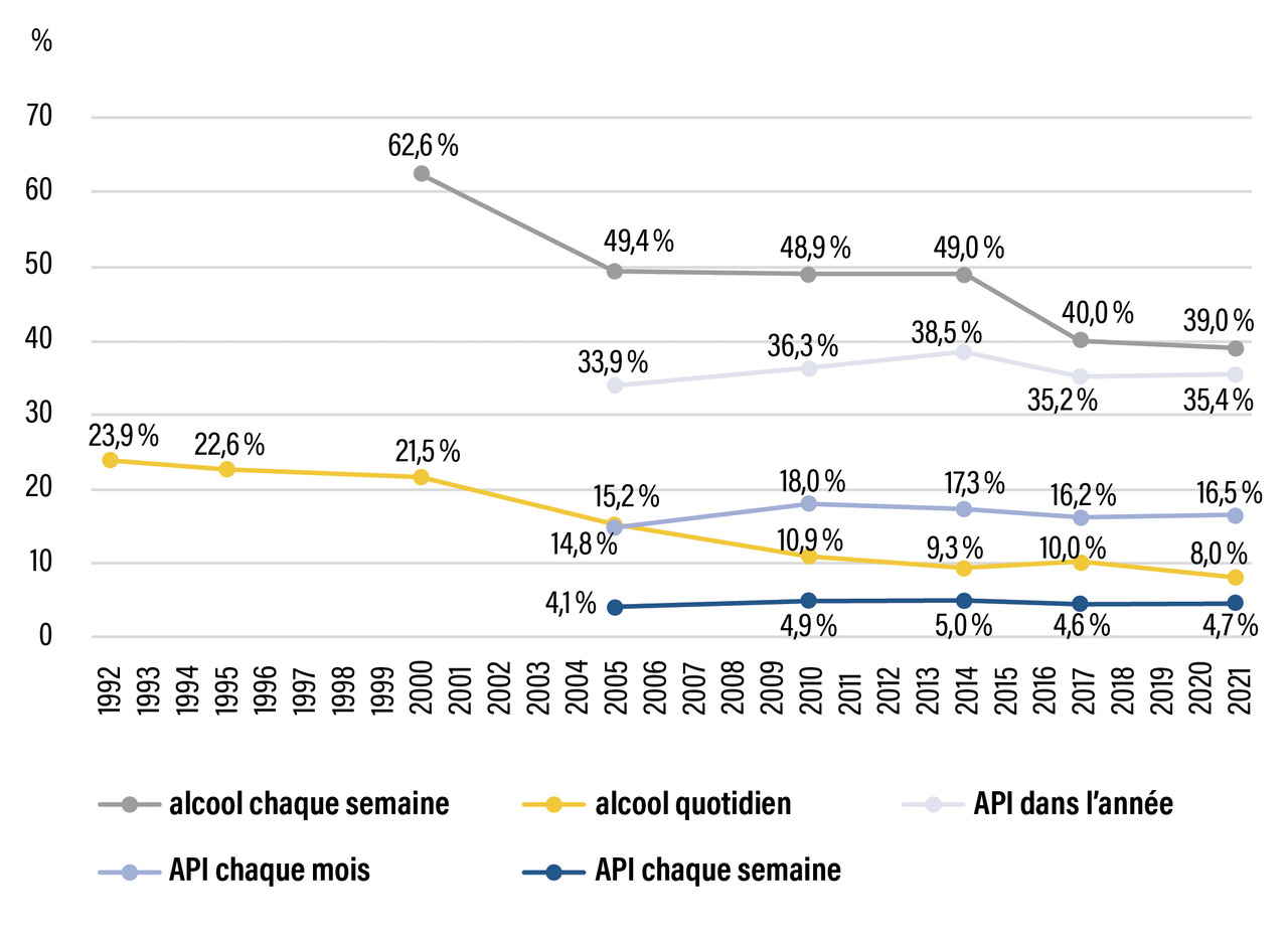 - la proportion d’adultes consommant de l’alcool tous les jours était de 23,9 % en 1992 contre 8 % en 2021.