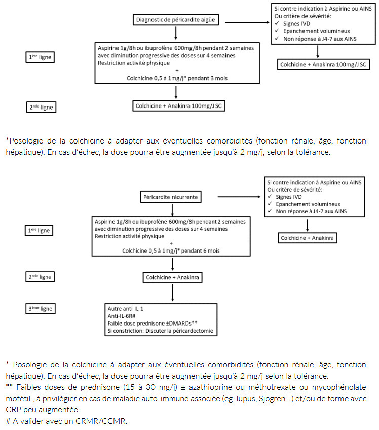 L’algorithme de traitement médicamenteux des péricardites est indiqué dans la figure.