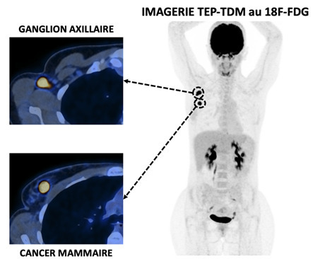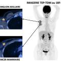 Lors du diagnostic d’un cancer du sein, comme pour le cancer de la prostate, l’imagerie permet d’évaluer l’extension de la maladie. L’évaluation loco-régionale est réalisée avec la combinaison mammographie et échographie associée à l’IRM mammaire dans certaines situations. La recherche de métastase ganglionnaire et à distance est effectuée grâce à la scintigraphie du ganglion sentinelle, la TEP-TDM au FDG ou par la combinaison TDM thoraco-abdomino-pelvienne et tomoscintigraphie osseuse. Un exemple de bilan d’extension initial par TEP-TDM au FDG est présenté en figure 2.