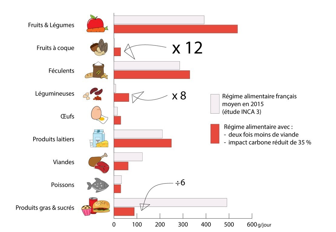 D’abord, il a fallu définir le régime alimentaire d’un adulte français (hors femmes enceintes et personnes âgées). Pour ce faire, les auteurs ont utilisé la dernière enquête des consommations alimentaires de l’Anses (INCA 3).4 Ils ont ensuite élaboré dix modèles alimentaires où la part de viandes est diminuée de moitié tout en faisant varier la réduction de l’empreinte carbone de 0 à 50 %. Le compromis s’est porté sur une alimentation avec un impact carbone de moins 35 % par rapport au régime actuel. Sachant que l’assiette d’un Français correspond à un quart de son impact carbone, cette réduction est non négligeable (figure).5
