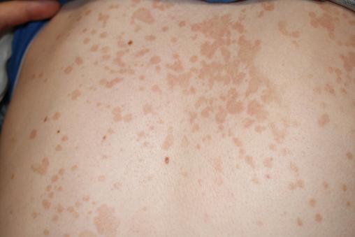 Cliniquement, on observe des lésions papuleuses asymptomatiques, squameuses aux frottements, arrondies et de taille variable (localisation : thorax et tronc). Elles sont le plus souvent hypopigmentées et sont donc plus marquées en cas d’exposition solaire. Cependant, sur des peaux peu ou non bronzées, elles peuvent avoir un aspect rose ou chamois (comme ici). Elles induisent alors possiblement le clinicien en erreur.
