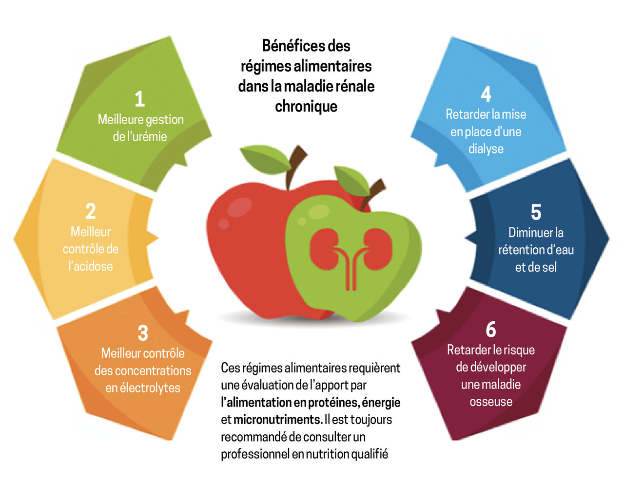 Si la nécessité de mettre en place des mesures diététiques pour les personnes atteintes de maladie rénale chronique ne fait pas débat du fait de ses nombreux bénéfices (fig. 2), leur mise en place reste délicate.