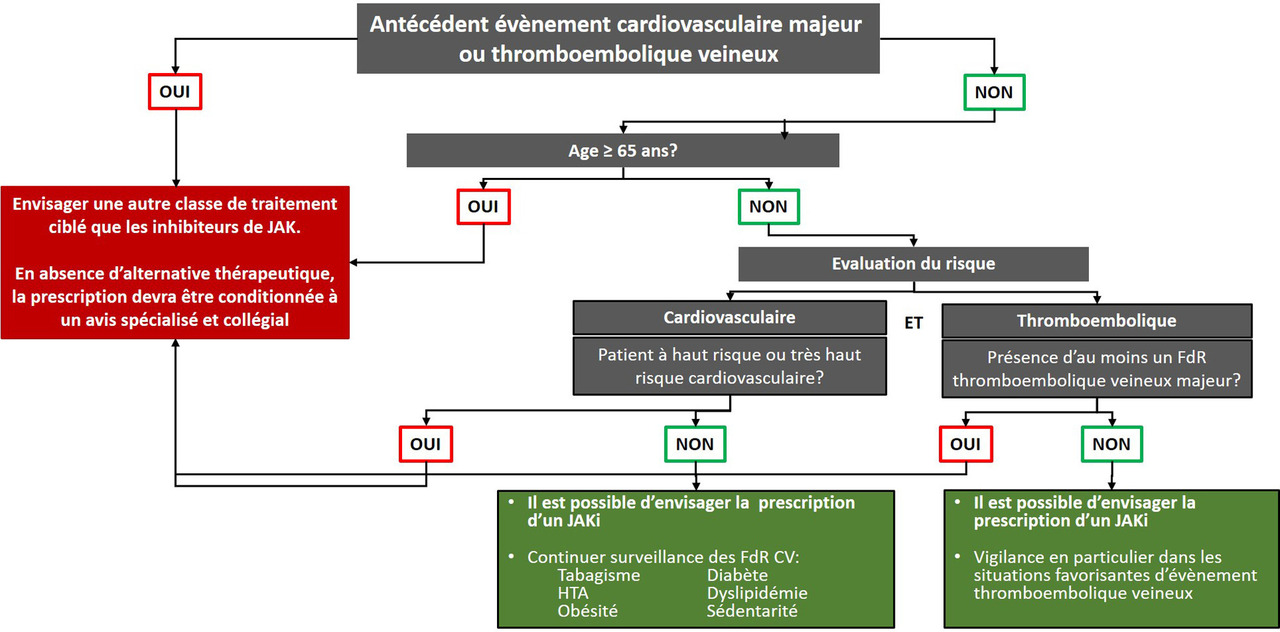 Les recommandations intègrent les données récentes sur le profil de risque cardiovasculaire et néoplasique des inhibiteurs de Janus kinase. En effet, l’essai ORAL Surveillance a montré un sur-risque d’infections sévères (dose de 10 mg × 2/j) et herpétiques (toutes doses), de néoplasies et de carcinomes cutanés (toutes doses) sous inhibiteurs de JAK. Ceci a conduit les agences américaine et européenne du médicament à émettre une alerte sur la sécurité d’utilisation de ces molécules , aboutissant à des restrictions d’utilisation chez des populations à risque. Plusieurs études observationnelles utilisant des données de registres ou bases de données d’assurances ont apporté des éléments rassurants, sans cependant annuler l’alerte.