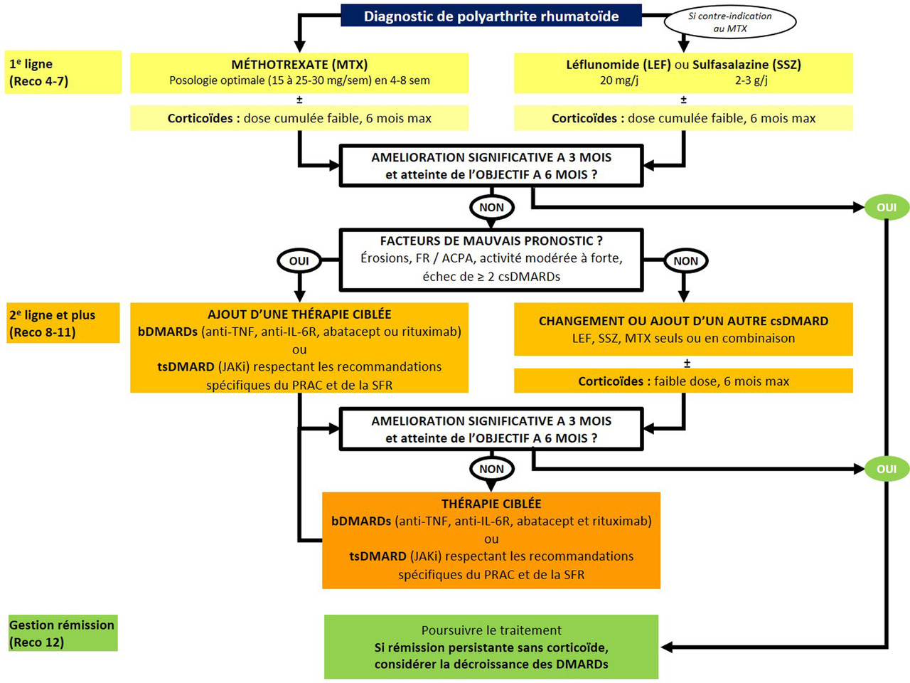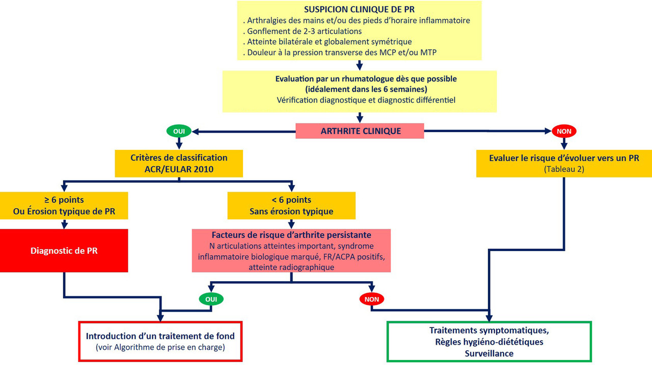 Dès que le diagnostic de PR est posé, un traitement de fond doit être débuté. Chez les patients ayant une arthrite mais ne satisfaisant pas les critères de classification ACR/EULAR 2010 (absence d’érosion radiographique typique et moins de 6 points), un traitement de fond doit être initié si un ou plusieurs facteurs de risque d’arthrite persistante sont présents (fig. 1).