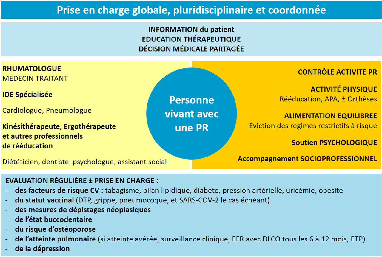 De ce fait, chez ces patients, on recommande des traitements symptomatiques, la correction des facteurs de risque par des règles hygiénodiététiques et la surveillance. La surveillance du risque de PR est recommandée sur 1 à 3 ans (période la plus à risque d’évoluer vers une PR), à un rythme adapté sur le niveau de risque évalué (initialement entre 3 et 12 mois) et repose avant tout sur la clinique. Elle pourra ensuite être espacée. Il est important d’apprendre à ces patients à reconnaître les signes justifiant une consultation plus rapide et en particulier l’apparition de gonflement articulaire.