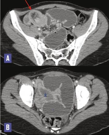 Cette femme de 19 ans consultait pour des douleurs abdominales diffuses et des vomissements post-prandiaux tardifs. Elle signalait des douleurs récurrentes et un arrêt des matières et des gaz. À l’examen, l’abdomen était distendu, avec un tympanisme à la percussion signant l’occlusion intestinale. Le bilan biologique était normal. L’échographie abdominale montrait une image d’invagination grêlo-grélique au niveau du pelvis. La tomodensitométrie confirmait l’invagination intestinale (fig. 1A ), avec à son pied une lésion ovalaire, bien limitée, hypodense, rehaussée faiblement et en périphérie après contraste (fig. 1B ). L’exploration chirurgicale trouvait une invagination iléo-iléale secondaire à une formation polyploïde intraluminale sessile ; l’anse invaginée était réséquée et la continuité rétablie par une anastomose grêlo-grélique termino-terminale. La pièce de résection de 21 cm renfermait un polype sessile de 40 x 20 x 20 mm avec, à l’examen histopathologique, un polype fibroïde inflammatoire (fig. 2 ). Les suites postopératoires étaient simples sur un recul de 3 mois.