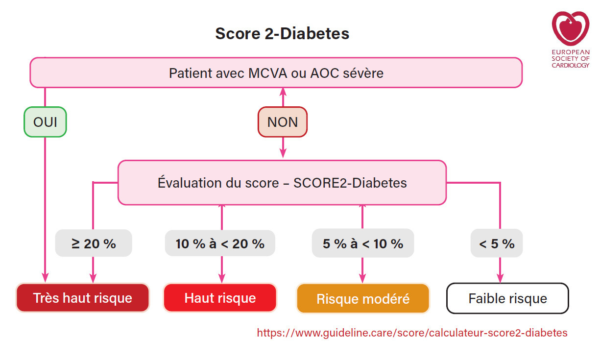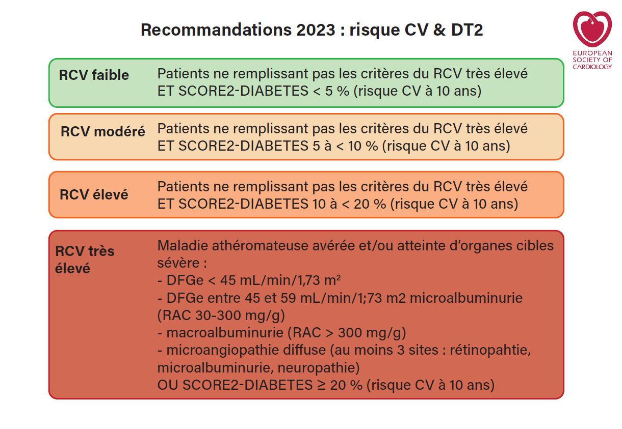Les Sociétés européennes de cardiologie (ESC) et du diabète (EADS) ont proposé en 2020 une classification des patients diabétiques (DT2 et DT1) avec trois catégories de risque :2