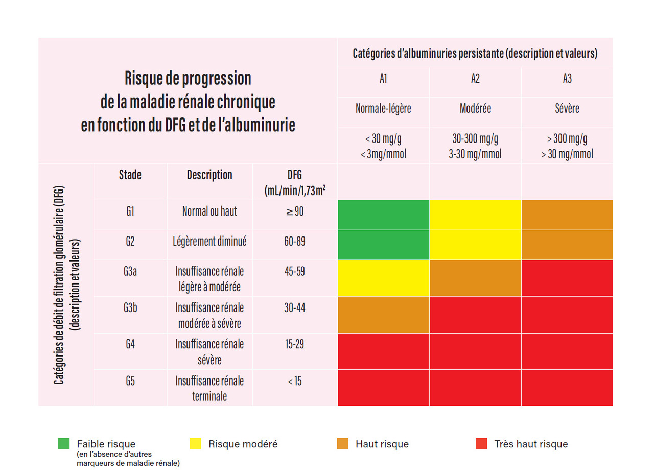 - rouge, risque très élevé de progression vers la défaillance rénale et de complications cardiovasculaires majeures ; nécessite une prise en charge spécialisée et renforcée.