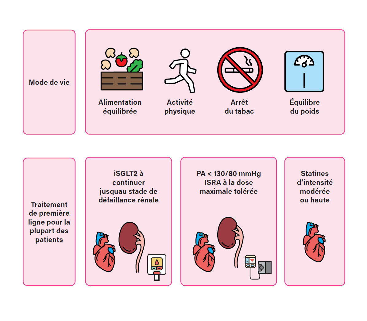 Sur le plan thérapeutique, la mise en route d’un traitement médicamenteux ne doit pas être retardée chez les patients atteignant au moins le niveau « jaune » dans la matrice KDIGO.3 Une stratégie pharmacologique adaptée inclut :
