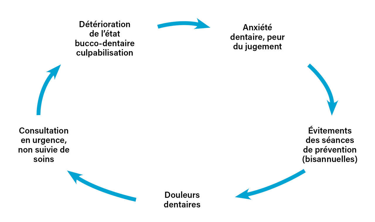 La détérioration de l’état bucco-dentaire mène alors à ce qui a été décrit comme le cercle de la peur dentaire (fig. 1), entraînant un sentiment culpabilisant qui représente une spirale négative, dont le patient ne peut se sortir seul.5