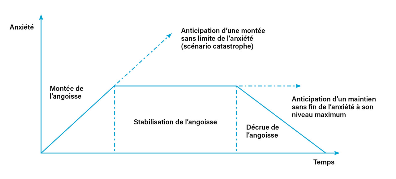 Une étude sur le projet pilote mené à Créteil par le service de médecine bucco-dentaire en synergie avec le service de psychiatrie montre que les patients souffrant d’une anxiété sévère sont peu nombreux mais nécessitent plus d’une dizaine de rendez-vous pour les amener à diminuer leurs symptômes. Dans ce projet, les thérapies cognitivo-comportementales par exposition permettent aux patients, petit à petit, de pouvoir consulter un praticien en dehors du milieu hospitalier. Cette thérapeutique a pour objectif d’exposer le patient à l’objet de son anxiété de manière à atteindre le maximum possible (qui n’est pas le scénario catastrophe) jusqu’à ce que le niveau d’anxiété diminue (fig. 2). L’objectif pour le patient est de réaliser que l’anxiété s’est arrêtée de monter, puis qu’elle a même fini par redescendre.