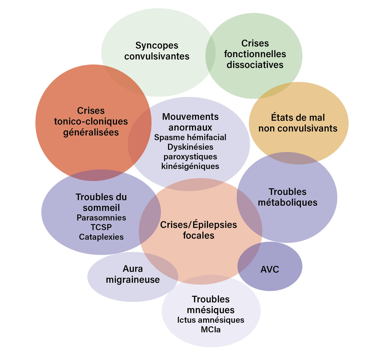 Les crises d’épilepsie selon leur type (focal, généralisé) et selon la localisation de la décharge peuvent se manifester par différents signes cliniques (clonies, paresthésies, confusion, manifestations hyperkinétiques, hallucinations…). La diversité de ces symptômes peut compliquer la distinction entre malaises d’origine épileptique ou d’une autre origine. Il convient de bien connaître les principaux diagnostics différentiels et leurs spécificités cliniques afin de ne pas sur- ou sous-diagnostiquer une épilepsie.1-3