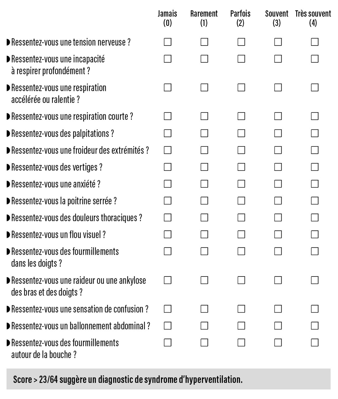 Un syndrome d’hyperventilation est à rechercher à l’aide du questionnaire de Nijmegen (fig. 3). Il s’agit à la fois d’un diagnostic différentiel et d’une comorbidité de l’asthme.2,14