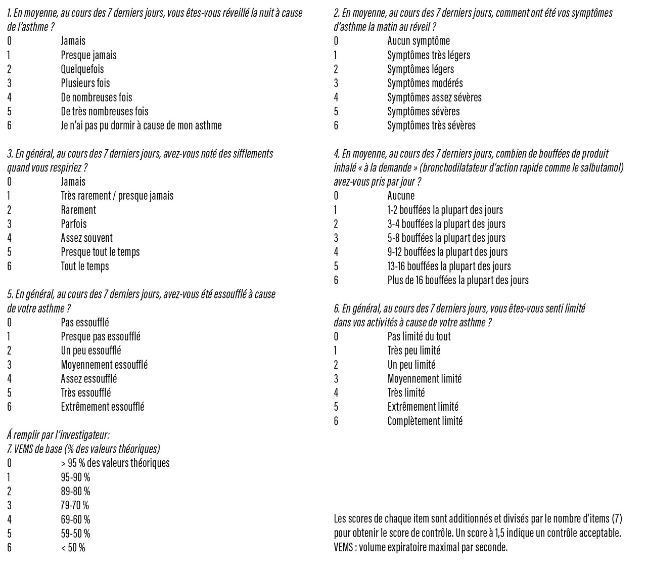 Une fois le traitement débuté, les ajustements de palier dépendent du contrôle de l’asthme, qui doit être évalué de manière objective. Pour cela, l’utilisation des questionnaires ACT (test de contrôle de l’asthme) avec cinq questions portant sur les symptômes des quatre dernières semaines (fig. 1) et ACQ (Asthma control questionnaire) avec six questions portant sur les symptômes des sept derniers jours (fig. 2) est recommandée. L’asthme est dit contrôlé si le score est supérieur à 20/25 pour l’ACT et supérieur à 1,5 pour l’ACQ. Le recours à ces outils est essentiel car la perception subjective du médecin est souvent incorrecte et différente de celle du patient.2,3 Les patients doivent être réévalués entre un et trois mois après l’introduction du traitement, puis tous les trois à douze mois selon l’évolution.