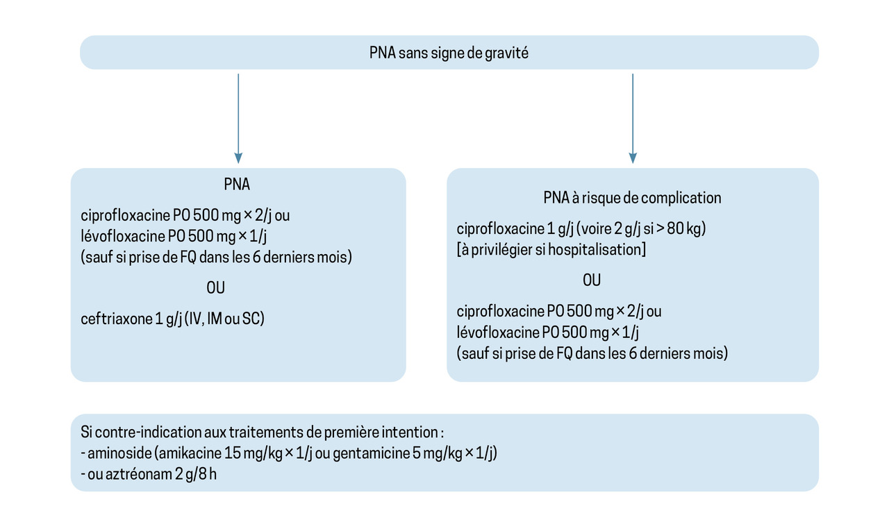 Parmi les formes sans signe de gravité, on différencie les PNA « simples », survenant chez la femme jeune sans antécédent, des PNA « à risque de complication » qui concernent la femme enceinte, la femme âgée de plus de 65 ans et en perte d’autonomie ou de plus de 75 ans, l’homme, les personnes immuno-déprimées, les PNA sur matériel (sonde urinaire, sonde en double J, néphrostomie) ou toute anomalie connue de l’arbre urinaire (sténose urétrale, cancer urothélial, lithiases, malformation). Cette distinction est nécessaire car elle guide la durée de l’antibiothérapie.