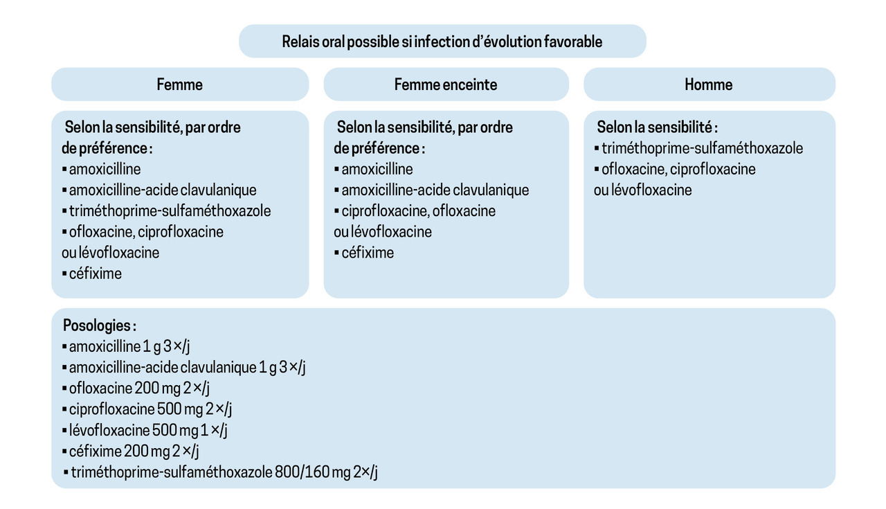 Un relais oral doit être privilégié si la bactérie identifiée est sensible. Les molécules recommandées sont, par ordre alphabétique : amoxicilline, amoxicilline-acide clavulanique, céfixime, fluoroquinolones et triméthoprime-sulfaméthoxazole (fig. 5).9