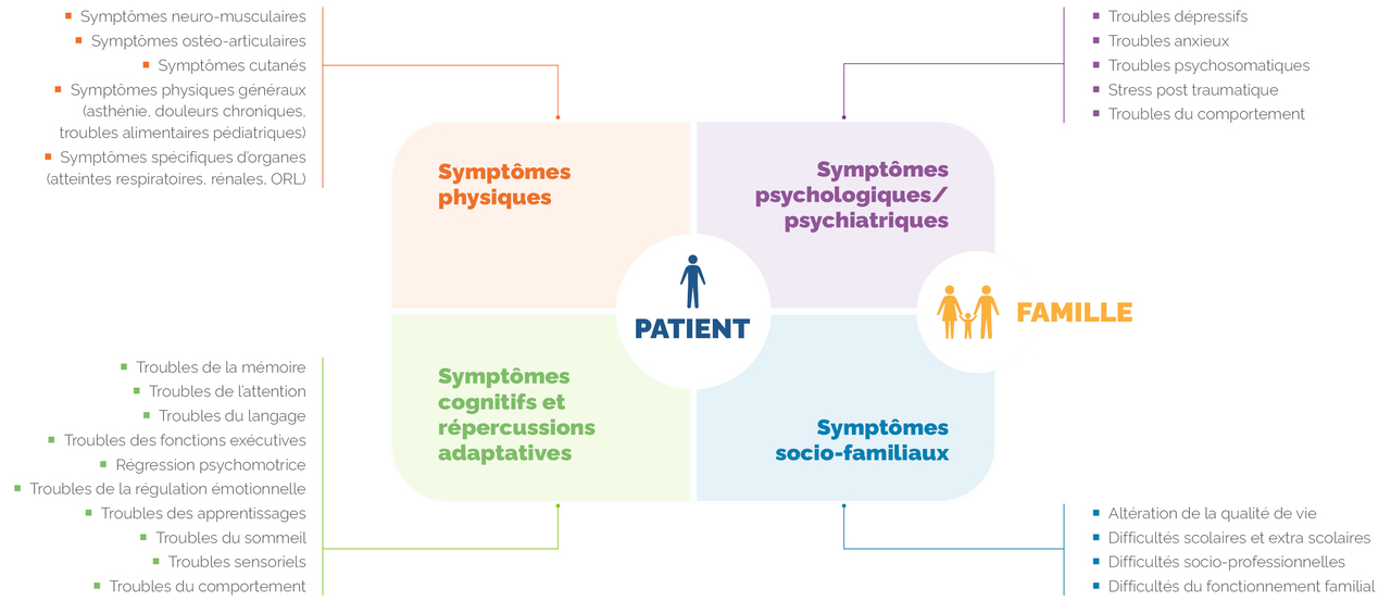 - sociofamiliaux : difficulté de retour à l’école voire refus scolaire anxieux, difficultés dans l’environnement extrascolaire ; altération du fonctionnement familial (parents et fratrie), répercussion sur l’activité professionnelle des parents, difficultés de retour à l’école pour la fratrie.