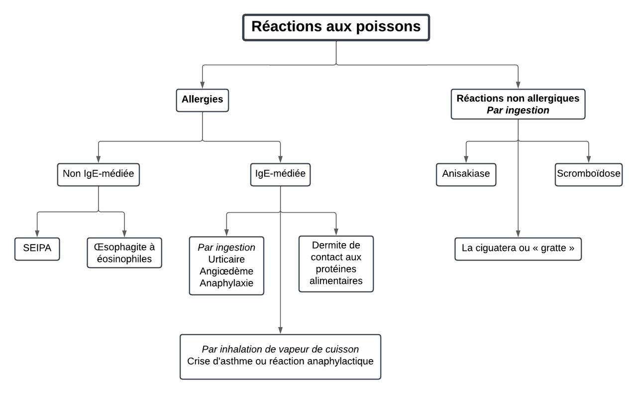 La consommation de poissons peut entraîner de multiples pathologies : il faut pouvoir distinguer les mécanismes initiaux pour une prise en charge adéquate. Les symptômes observés sont-ils allergiques ou non ? La recherche du facteur déclenchant, la chronologie, la nature du poisson ingéré et les signes cliniques peuvent orienter le diagnostic.