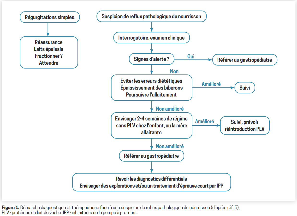 En cas de suspicion de RGO pathologique (fig. 1), une fois éliminés les signes d’alerte (v. ci-dessus), on recommande en première intention les mesures hygiénodiététiques (correction des erreurs diététiques, épaississement du lait…). Si elles ne sont pas suffisantes : mettre en place pendant 2 à 4 semaines une éviction des protéines de lait de vache, l’APLV étant le principal diagnostic différentiel : on utilise un hydrolysat de PLV ou une formule d’acides aminés à la place du lait habituel chez les nourrissons sous lait artificiel ; pour ceux allaités de façon exclusive : régime strict d’éviction chez la mère.