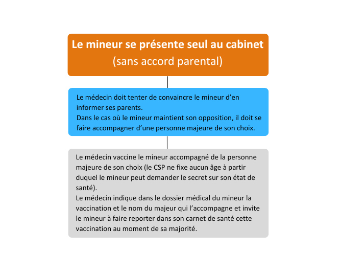 Dans ce cadre des vaccinations recommandées, le Cnom indique aussi la possibilité d’impliquer dans la décision l’enfant, s’il est « mature » en matière de santé, c’est-à-dire capable de comprendre et de participer aux décisions médicales qui le concernent (bien que l’âge ne soit pas précisé, il s’agit généralement d’un adolescent de plus de 12 - 13 ans). Si le mineur souhaite se faire vacciner, mais que les parents s’y opposent, Il est tenu de choisir un majeur référent qui l’accompagne au cours de sa prise en charge (article L. 1111 - 5 du CSP). Une vaccination confidentielle est possible dans certains cas limités (ex : HPV, etc.), « si l’enfant est jugé mature et autonome » (article L. 1110 - 4 du CSP).
