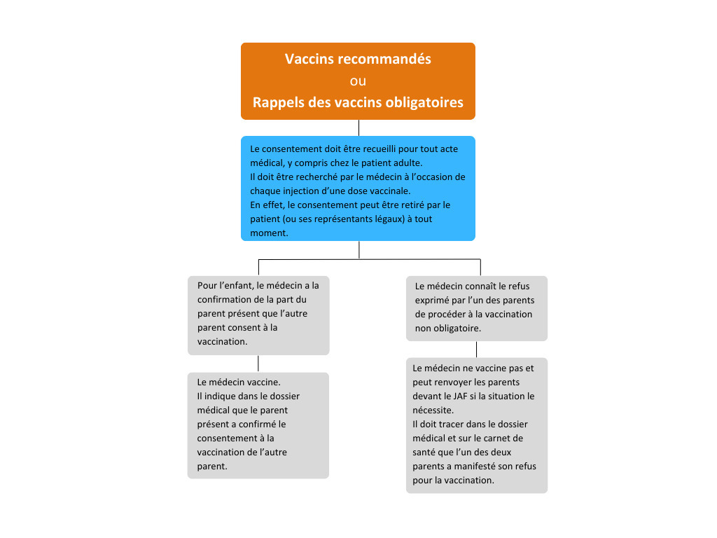 La vaccination recommandée n’étant pas considérée comme un acte usuel, il est impératif d’obtenir l’autorisation des deux parents, y compris en cas de séparation. Le médecin doit donc s’assurer qu’il n’y a pas d’opposition de la part de l’autre parent. S’il administre le vaccin recommandé en connaissance du refus, il commet une faute déontologique et sa responsabilité pénale pourra être éventuellement engagée. Le médecin doit, le cas échéant, inscrire dans le carnet de santé et le dossier médical de l’enfant le refus des deux parents.