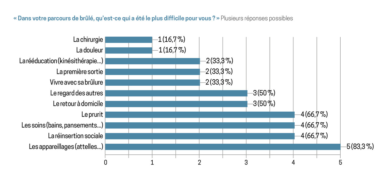 - Le questionnaire a révélé que tous les professionnels pensent que les brûlés rencontrent des difficultés psychosociales du fait de leur brûlure, et donc des difficultés de réinsertion à cause du regard de l’autre, mais également du fait des moqueries, d’une perte de chance de trouver un emploi, des douleurs, de la fatigue, d’une forme d’autocensure des adultes – limitant les interactions sociales, notamment en cas de brûlures au visage –, des absences au travail, des opérations chirurgicales, de l’éloignement de la famille et la destruction du logement (quand un incendie est en cause).