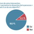 - 85 % des professionnels de santé ayant répondu travaillent en centres de rééducation, 4 % en centre de traitement des brûlés (CTB) et 1 % en centre de soins aigus (66,7 % en pédiatrie, 44,4 % en service adultes). Les trois professions les plus représentées étaient les ergothérapeutes (48,1 %), les kinésithérapeutes (25,9 %) et les médecins (14,8 %). Dans la question ouverte « Quels sont vos objectifs dans l’accompagnement du brûlé ? », quatre items ressortent : amélioration de la cicatrice, amélioration fonctionnelle, équipement, travail sur les activités de la vie quotidienne et autonomie. La notion de réinsertion psychosociale est évoquée deux fois sur 27 réponses. Cependant, à la question fermée « Lors de votre intervention, permettre la réinsertion de la personne est-il un de vos objectifs ? », 88,9 % des professionnels répondent par l’affirmative (fig. 2). Selon les réponses, les moyens utilisés sont la récupération esthétique et fonctionnelle, le travail multidisciplinaire, l’écoute et l’échange avec le patient et sa famille, le suivi psychologique, les jeux de rôle ou les visites à domicile, les liens avec l’extérieur (travail, école, association), l’éducation thérapeutique du patient, l’évaluation de la performance et l’engagement occupationnel.