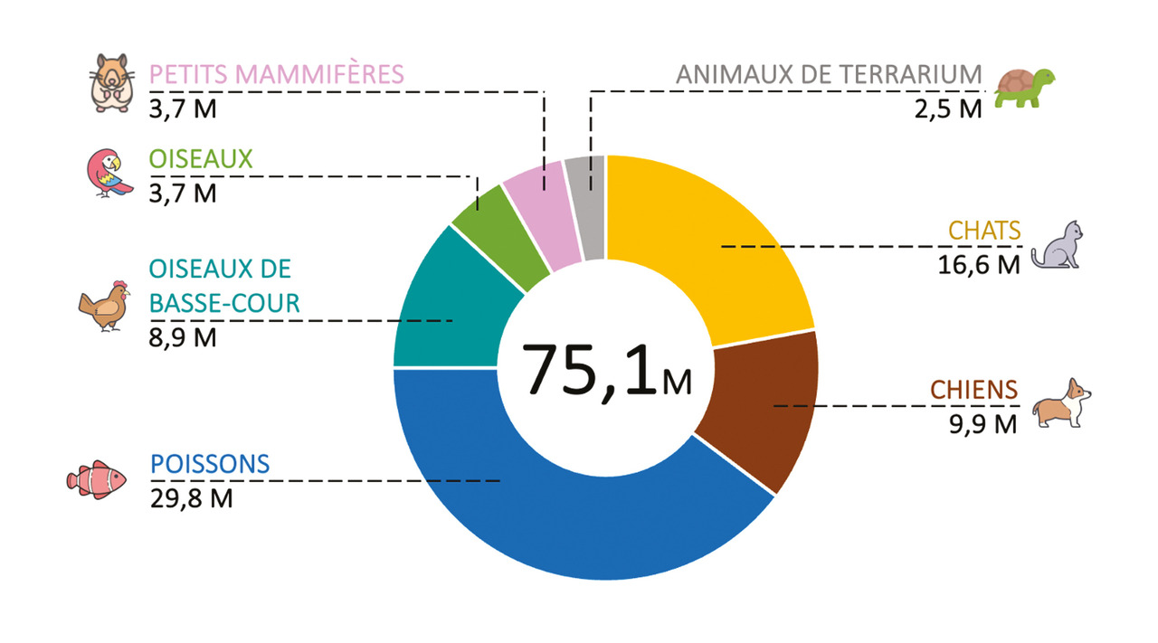 Il est difficile d’estimer le nombre d’ACNT en France car peu d’espèces sont identifiées par des puces électroniques, comme c’est le cas de la majorité des chiens et les chats domestiques. En moins de cinq décennies, le nombre d’animaux de compagnie (dont les chats et les chiens) est passé de 30 millions en 1976 à 75 millions en 2024 (fig. 2). Si l’on excepte les poissons, la poule est même devenue le troisième animal de compagnie.
