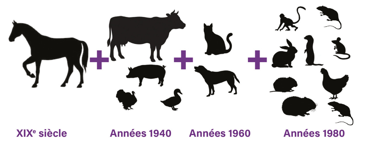 Depuis quelques décennies, l’engouement des particuliers croît pour des animaux autres que le chien et le chat, qu’il s’agisse d’animaux possédés au domicile ou de certaines espèces animales présentes dans des lieux publics destinés aux enfants, comme le démontre l’évolution de la diversité des espèces animales consultées en pratique vétérinaire depuis le XIXe siècle (fig. 1).