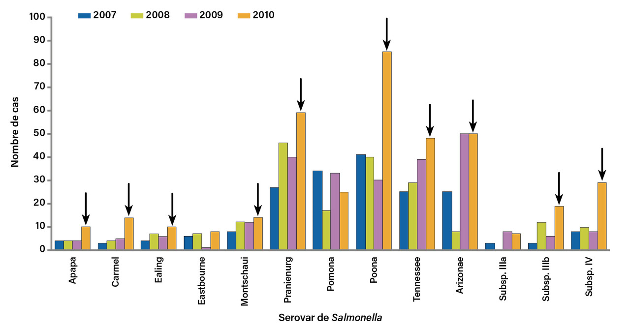 - salmonellose résistante aux fluoroquinolones liée à l’utilisation de ces antibiotiques chez les reptiles ;8