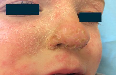 Ces derniers jours, il se gratte sans arrêt et se plaint d’avoir mal au nez. Il a toujours eu la peau sèche. D’autres épisodes d’éruption cutanée ont atteint les creux poplités. Sa mère a un asthme allergique.