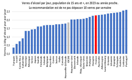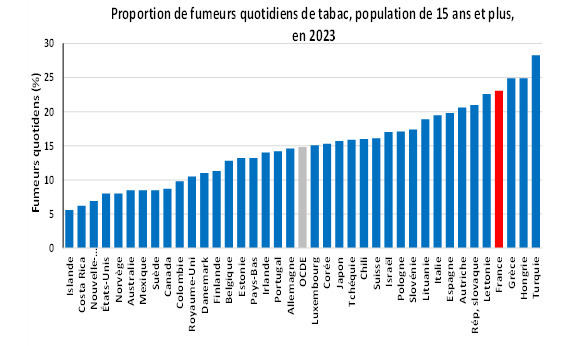 - la faible proportion des dépenses de santé allouées à la prévention contribue certainement à la forte prévalence du tabagisme quotidien (figure 3), à l’importante consommation d’alcool (figure 4), à la participation insuffisante au dépistage organisé du cancer du sein, à la couverture incomplète de la population pédiatrique ayant reçu trois doses du vaccin contre la diphtérie, le tétanos et la coqueluche (qui illustre la non adhérence de la population à une activité de prévention essentielle) et peut-être aussi à l’abus d’antibiotiques (le volume total d’antibiotiques prescrits en milieu extrahospitalier est très supérieur à la moyenne de l’OCDE) ;