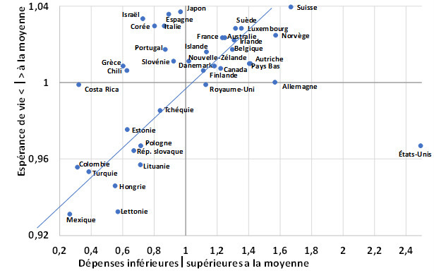 Dans de nombreux pays, l’espérance de vie est corrélée avec les dépenses de santé : il s’agit des pays situés sur la ligne oblique qui va du Mexique à la Suisse. Mais les exceptions sont particulièrement intéressantes. Le Costa Rica, la Grèce, le Chili, le Portugal, et surtout Israël, la Corée, l’Italie, l’Espagne et le Japon, consacrent à la santé des dépenses inférieures à la moyenne de l’OCDE mais affichent une espérance de vie supérieure. Cela peut indiquer que les systèmes de santé ont un bon rapport qualité-prix, même si de nombreux autres facteurs ont aussi une incidence sur les résultats en matière de santé. En revanche, l’Allemagne, et surtout les États-Unis, dépensent beaucoup d’argent pour de très mauvais résultats.