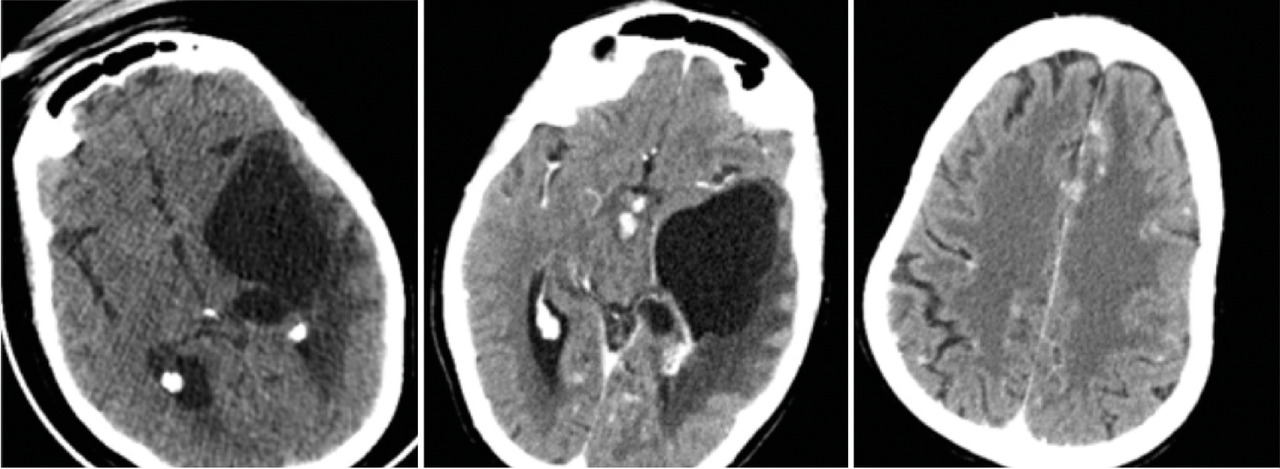 Cette femme de 44 ans avait un tableau d’hypertension intracrânienne et des troubles du comportement, un syndrome pyramidal droit, une paralysie faciale centrale droite, un syndrome confusionnel et un œdème papillaire ; pas de particularité pour le reste de l’examen, notamment pulmonaire. Le bilan biologique (test de sensibilité à la tuberculine, antigène carcinoembyonnaire, métabolisme calcique, cytologie du lavage bronchoalvéolaire) et la radiographie pulmonaire étaient normaux. La tomodensitométrie (TDM) cérébrale (fig. 1 ) montrait une lésion kystique temporale gauche exerçant un effet de masse sur la ligne médiane avec un œdème périlésionnel. Après injection il y avait une prise de contraste micronodulaire leptomeningée diffuse et de la corne occipitale du ventricule latéral gauche. L’imagerie par résonance magnétique (IRM) [fig. 2 ] montrait une volumineuse lésion kystique expansive temporale gauche, dont les parois ne se rehaussaient pas après injection du produit de contraste avec un hypersignal T2 périlésionnel ainsi qu’un engagement temporal. La résection chrirugicale et la corticothérapie permettaient une amélioration neurologique immédiate. L’histologie était en faveur d’un granulome épithéloide gigantocellulaire sans nécrose caséeuse.