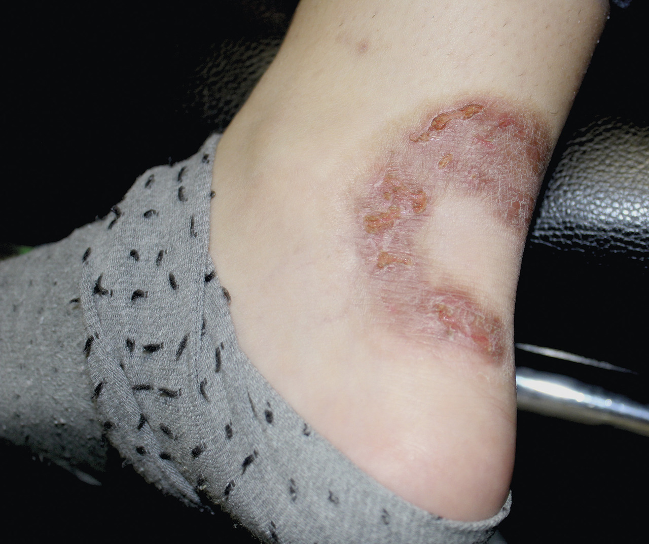 Sylvie, 20 ans, consulte car elle a depuis plusieurs mois une lésion en anneau au niveau de la base du tendon d’Achille gauche, indolore, limitant les mouvements du pied, qui persiste malgré l’application d’antifongique. La patiente a l’impression que le bourrelet périphérique devient dense et ulcéré. Une biopsie est effectuée.