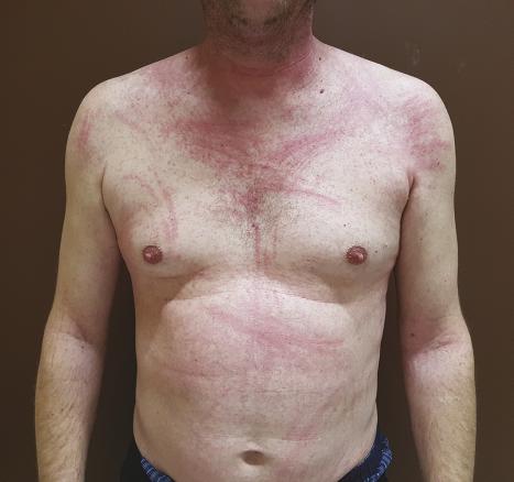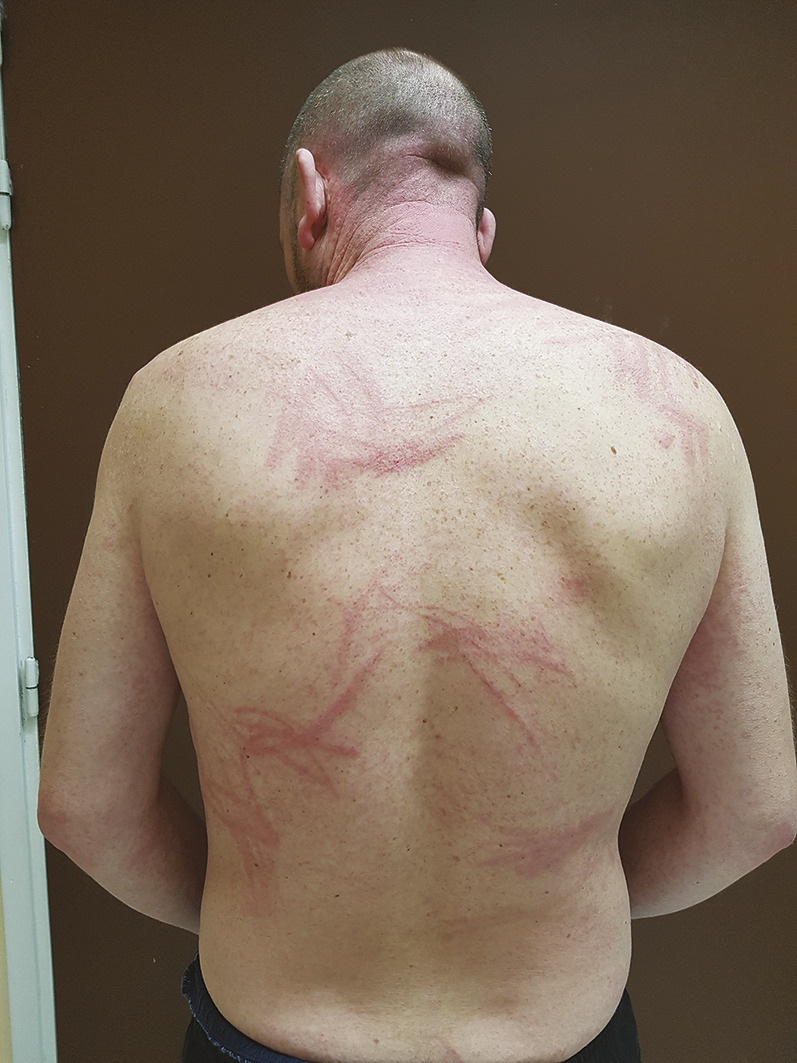 Cet homme de 40 ans, sans antécédent, consultait pour une éruption cutanée tronculaire prurigineuse, évoluant depuis 24 heures. L’interrogatoire ne trouvait pas d’application topique ou d’introduction de traitement récent. L’examen clinique notait des lésions papulo-érythémateuses groupées de façon linéaire, à disposition flagellée prédominant sur le tronc (fig. 1 et 2) et le visage, sans atteinte muqueuse. Le bilan biologique était normal. L’histoire alimentaire révélait la consommation de champignons surgelés shiitakés le jour précédent l’apparition des lésions. Devant cet anamnèse et cet aspect typique, le diagnostic retenu était celui de dermatite flagellée au shiitaké. Un traitement par dermocorticoïdes et antihistaminiques permettait une régression complète de l’éruption en 10 jours, sans séquelle pigmentaire.