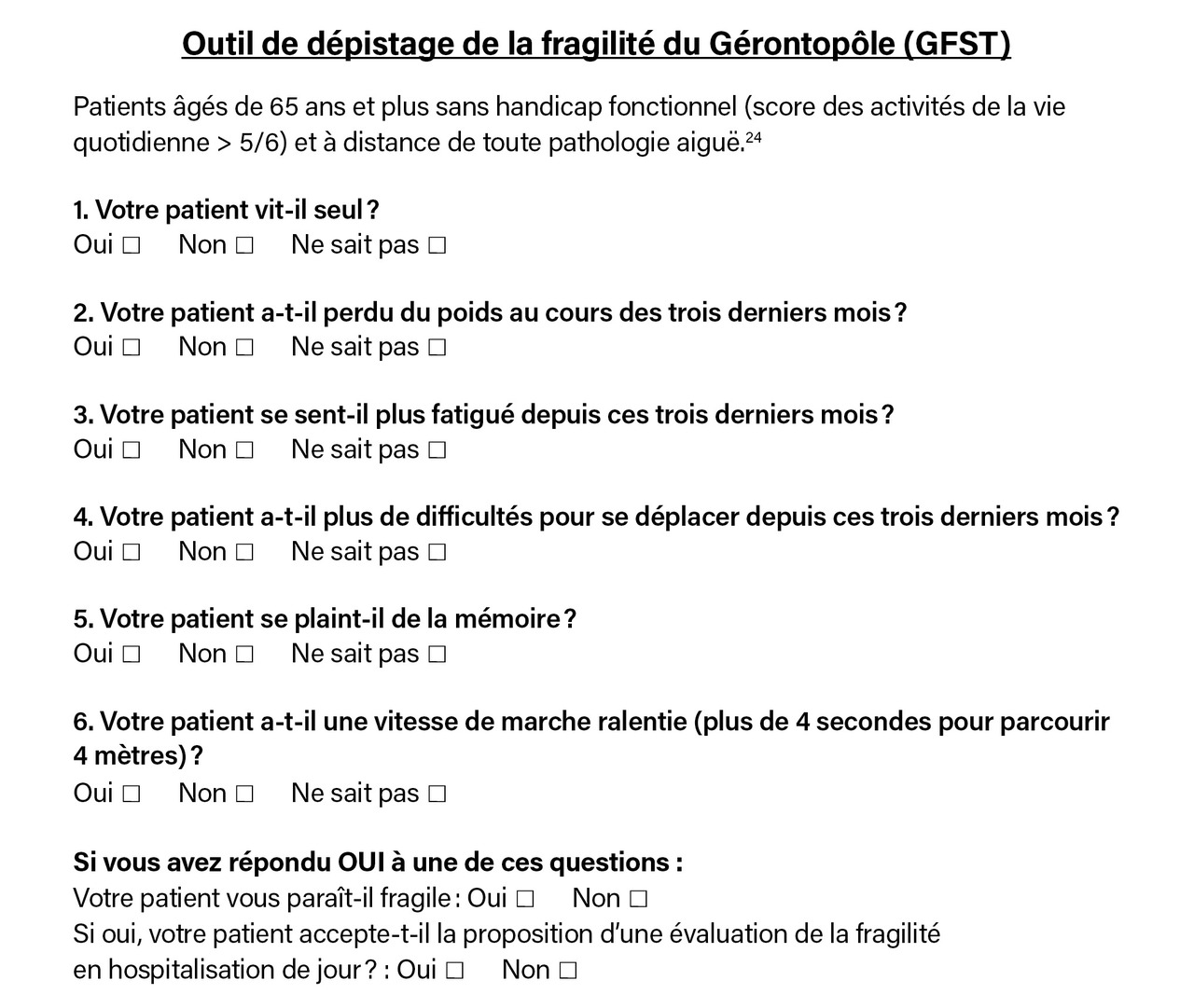 Bien que plusieurs questionnaires et méthodes d’évaluation de la fragilité aient reçu une validation scientifique22 - 27 et soient à disposition des professionnels, il n’en demeure pas moins que ces outils s’inscrivent dans une démarche d’accompagnement comprenant l’évaluation globale de la personne et la planification d’interventions de prévention formalisées dans un plan personnalisé de soins.21 Il s’agit d’une démarche multidimensionnelle qui doit s’intégrer dans la pratique clinique quotidienne. Par exemple, la grille GFST (gérontopôle frailty screening tool), élaborée par le Gérontopôle de Toulouse, qui permet la détection de la fragilité,24 est recommandée pour une utilisation en médecine de premier recours (figure).28