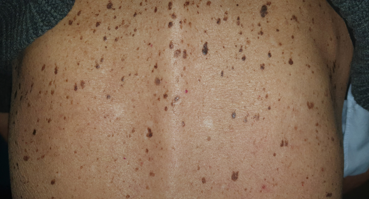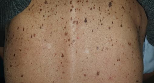 Cliniquement, on objective une floraison rapide et importante de formations pigmentées rattachées à l’épiderme ayant un caractère râpeux. Dans 50 % des cas, un prurit est constaté ; dans près de 40 % des cas, un acanthosis nigricans s’y associe (pigmentation cutanée généralement centrée en région cervicale) . Le plus souvent, les lésions de kératose séborrhéique sont mises en évidence au niveau du tronc (76 %) et des membres (38 %).