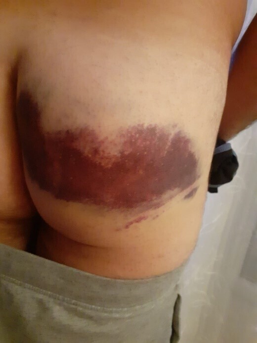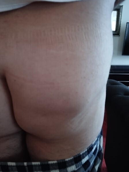 Un mois après le traumatisme, il constate l’apparition d’une tuméfaction collectée d’une quinzaine de centimètres sur le quadrant inférieur de la fesse.