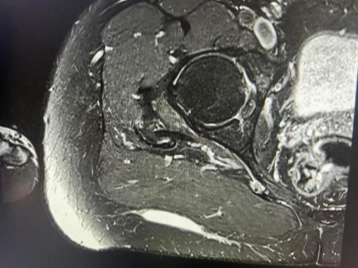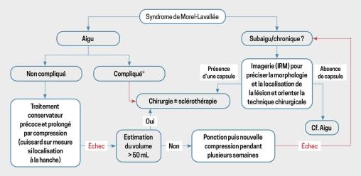 Devant l’aspect clinique de collection récidivante séro-hématique post-traumatique et l’aspect compatible en IRM, le diagnostic de syndrome de Morel-Lavallée est évoqué.