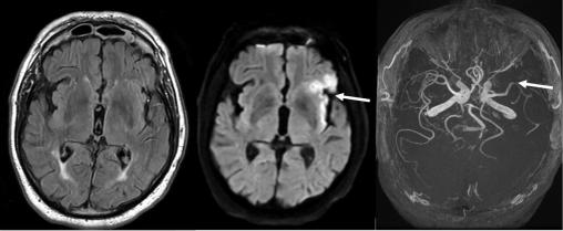 Mme X, 55 ans, sans antécédents médicaux notables, consulte pour un épisode de paresthésie transitoire du membre supérieur droit et une aphasie. L’examen clinique révèle un livedo racemosa marqué au niveau des membres inférieurs et du tronc (fig. 1). L’IRM cérébrale met en évidence des lésions ischémiques multiples en territoire sylvien superficiel gauche (fig. 2). Le bilan immunologique retrouve la présence d’anticorps antiphospholipides (anticardiolipines et anticoagulants lupiques).