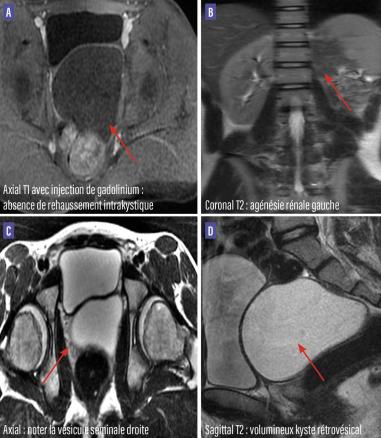 Un jeune homme de 20 ans, sans antécédents particuliers, se plaint de gêne pelvienne minime depuis un an. L’examen clinique et le bilan biologique sont normaux. Une échographie pelvienne initiale révèle une formation kystique rétrovésicale. Une imagerie par résonance magnétique (IRM) secondaire montre une agénésie rénale gauche et l’absence de visualisation de la vésicule séminale gauche, avec la présence d’une volumineuse formation purement kystique rétrovésicale en hypersignal T2, hyposignal T1, à paroi fine sans cloison ou septas (figure). Devant cet aspect, le diagnostic de syndrome de Zinner est retenu.