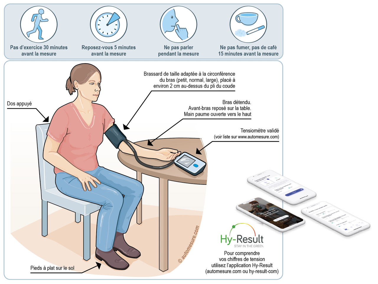 Il est recommandé d’utiliser les tensiomètres ayant obtenu le marquage CE (conformité européenne) et validés. Le site www.automesure.com met à disposition une liste de ces appareils. Les conditions pratiques d’automesure doivent être clairement expliquées au patient (