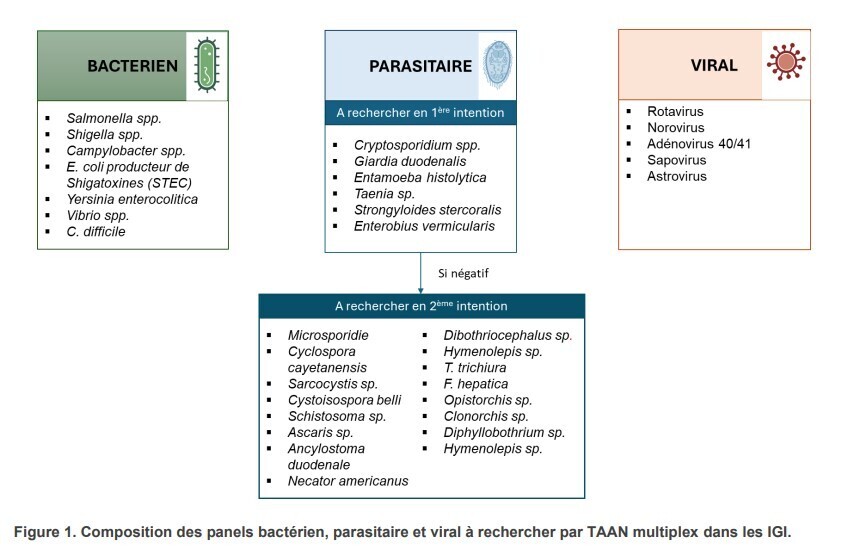 Les techniques d’amplification des acides nucléiques (TAAN) regroupent un ensemble de méthodes en biologie moléculaire – dont la PCR – permettant de multiplier de façon exponentielle une séquence spécifique d’ADN ou d’ARN. Les TAAN multiplex permettent de rechercher simultanément plusieurs microorganismes, en fonction des panels choisis (bactérien, parasitaire, viral ; v. fig. 1).