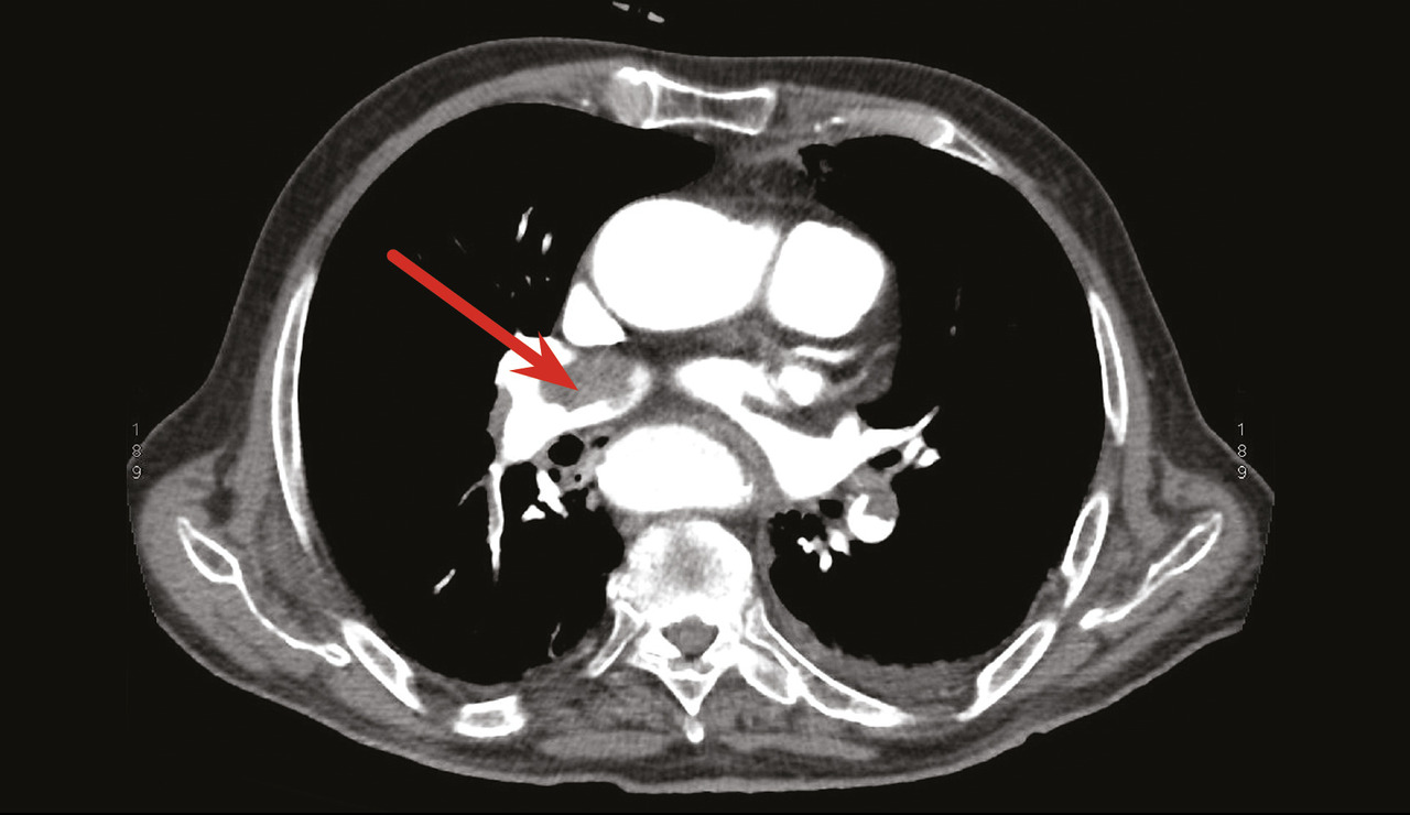 Un angioscanner thoracique objective une embolie pulmonaire bilatérale (